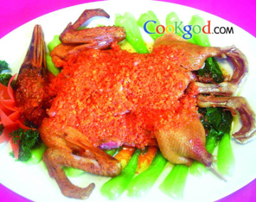 2、色拉油烧至140度下整鸭中火炸约3分钟至熟;取起后切成24件;摆于碟中汆熟的菜芯上成鸭形 。