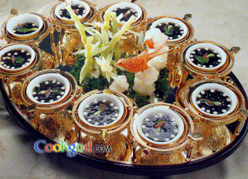 水发官燕、竹燕各100克,鱼蓉、螃蟹各300克,马蹄50克,黄芽菜心100克,珧柱、鸡汤、盐、味精、陈醋、胡椒粉、黄酒各适量