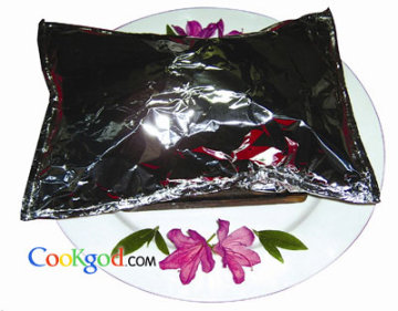 4、铁板连同锡包上中火烧至锡包开始膨胀即转小火烧至鸡熟、锡包成大气泡时即可(共计加热15分钟)。