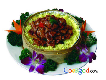 1、将泰国香米放入容器中加入150克水大火上笼蒸20分钟后取出。