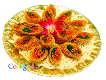 4、将炒好的原料放入平铺的鸡蛋饼上,然后将鸡蛋饼卷起成筒状,用湿淀粉封好口,放入烧至五成热的色拉油中小火浸炸2分钟后取出,上桌时改刀成块即可。