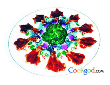 4、鱼蓉加入精盐、味精、姜、葱、料酒各3克调味打上劲,酿在鳖腿上,放上火腿末、香菜叶,上笼大火蒸8分钟至熟取出,围在鹅掌四周。