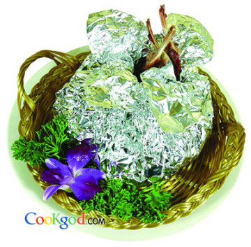 2、锅中放色拉油烧至五成热,将兔腿放入油中小火炸3分钟至发酱红色时取出,用锡纸包裹即可。