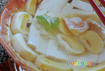 二、用猪油炝锅,先下葱丝和姜丝一煸,再下黄酒一烹(烹),跟首将糖、酱油、味精、清汤、口蘑原汤(适量)、口蘑片、豆腐块放进,继续用温火焖熟,见豆腐由硬见软,汤将收干即好。