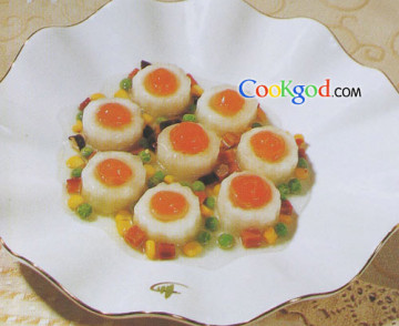 冬瓜800克,咸蛋黄10个,玉米粒、豌豆、西式火腿各20克调料盐、味精、高汤各少许