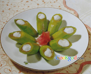 2、丝瓜去皮,切斜段,当中挖空,酿入调好味的鱼蓉,撒上火腿末,蒸熟。