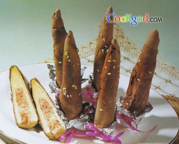 1、春笋去尾,用高汤煨透。咸肉切薄片,塞入春笋中待用。