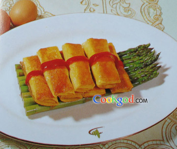 3、牛肉馅加香菜用蛋皮包好,用油煎至两面金黄,捆上红辣椒圈,放在焯熟的芦笋条上,带鸡汁酱上桌。
