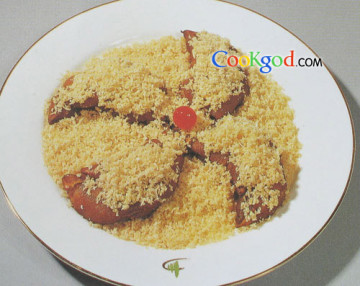 3、起油锅至七八成热时放入猪蹄炸酥捞出,装盘,面包糠下锅翻炒,撒在猪蹄上即成。
