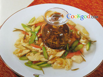 1、鸡脯肉切片,腌渍上浆。芦笋改刀,与火腿片、鸡片用龙井茶汁炒熟。