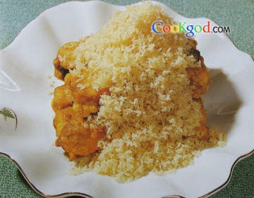 3、面包糠用油炸成金黄色,放葱花、红椒末、蒜末、味精、椒盐,炒好撤在子排上。