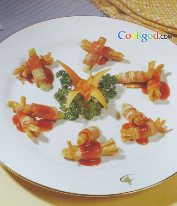 1、早餐肠、芥蓝分别切成3厘米的长条,两头切十字花刀,卷上烟肉卷。