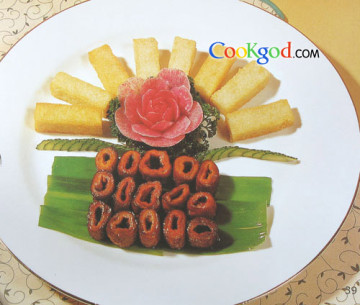 3、葱叶、黄瓜片做好盘饰,把烧好的大肠和糯米条在盘中摆豪形。