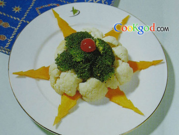 西兰花、花菜各50克,胡萝卜片适量,樱桃1个调料盐5克,味精3克,香油10克