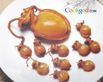 大墨鱼、墨鱼子去皮洗净,入烧料中焖烧,加入调料,墨鱼子卤l0分钟至熟,大墨鱼卤25分钟至熟,整齐地摆入盘中即成。