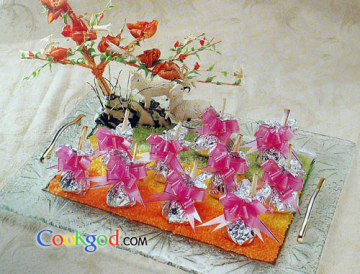 2、将拌好的馅料用猪网油包好,插入羊骨,拖蛋液、拍面包糠,成形,入油锅炸至金黄,用锡纸包好,扎上装饰花即成。
