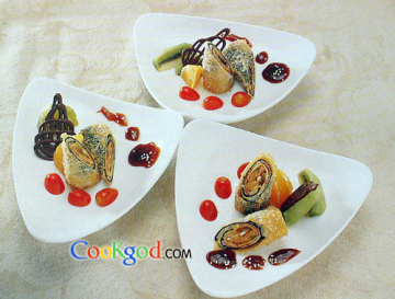 1、将威化纸、紫菜、蛋皮、豆皮、蟹柳依次叠好,放上青瓜、烤鳗条,卷成长卷,拖蛋黄液、拍面包糠,成形,入油锅炸至金黄色,斜切成两段,摆于盘中。