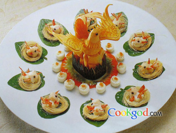 这道菜改原来的蒸制为炸制,且每只喜鹊都配上自己的金丝窝,使造型更加逼真。