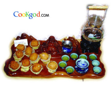 6、将沏好的茶放入茶杯中,跟炸好的芋球一同上桌,客人可以边饮茶边品尝芋球。