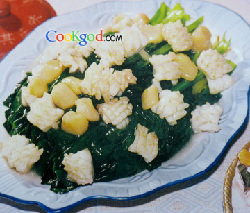 3、锅内放猪油烧热,下入乌鱼、鲜贝肉煸炒,烹入余下的料酒、葱姜汁和汤30克炒开,加入余下的精盐、鸡精炒匀至熟。加味精、用湿淀粉勾芡,出锅盛在盘内芥蓝上即成。