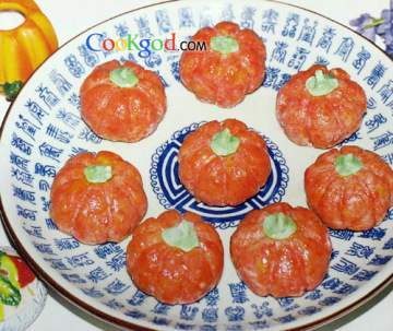 4、取胡萝卜泥50克按成小圆饼,放上25克馅料。收口捏严团成球状,再制成小南瓜状,点缀上南瓜蒂。全部做好后,摆入蒸锅内。蒸制熟透取出,摆入盘内即成。
