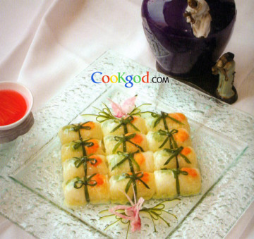3、取1张白菜叶圆片平放砧板上,�黄垫底,放上�肉馅,包成长5厘米、宽3厘米的长方形。取韭菜叶一条扎好打结。如此共制成12个,上笼蒸3分钟,取出浇淋热猪油装盘,和姜汁、香醋碟一同上席。