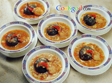 2、再用上汤蒸至熟,淋扒上蟹黄,另跟上汤一碗上桌即成。