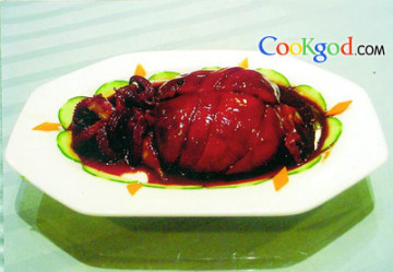 2、锅入黄油,烧至六成热时入蒸鱿鱼的原汁、红糖、米醋小火调味,用水淀粉勾芡,出锅浇在鱿鱼上。