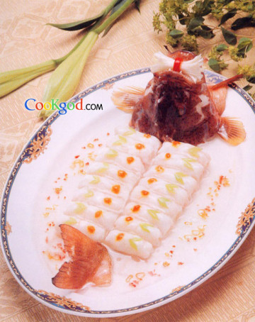 2、鱼剁去头尾,将两边鱼肉取出,斜切,将鱼肉片薄片至鱼皮处,逐片用蛋清、味精、淀粉上浆,加鱼蓉逐片做成相连鱼卷,虫寻黄、芥菜装饰置于鱼卷上,上笼蒸至熟透取出。
