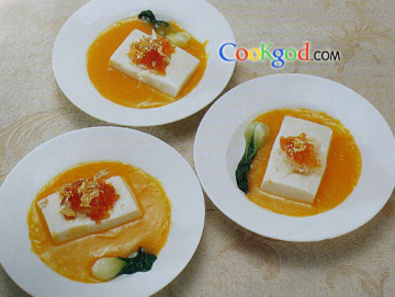 豆腐800克,南瓜泥150克,燕窝250克,鸡清汤500克,小菜胆12棵