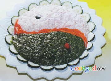 4、盘内用胡萝卜片隔成s型,在另一侧盛入鸡糊,即成。