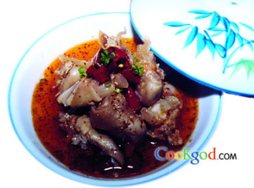 2、将花椒油、辣椒油、味精、盐、白醋调成汁,放入蹄筋中拌匀再腌渍1小时后取出装盘,上桌时撒上葱花、干红辣椒即可食用。