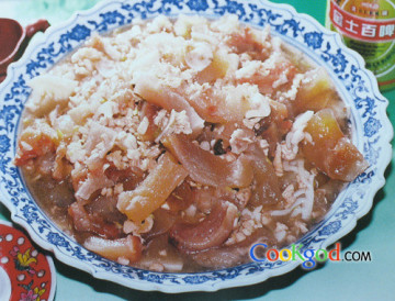 3、炒锅内另加油,下入葱,姜。蒜炝香,下入焯透的鹿筋,料酒,精盐、鸡汤,冬笋烧至软烂。