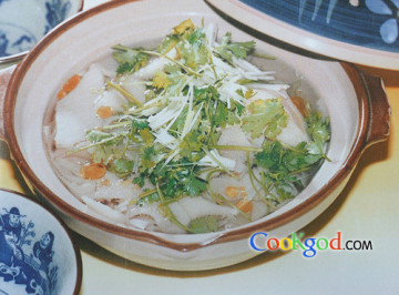 4、下入香菜段、葱丝、味精、鸡油即成。