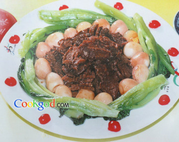 4、下入鸽蛋、精盐2克烧干汤汁,用淀粉勾薄芡,出锅装盘,鸽蛋围在鲍鱼四周。用余下的油、精盐将菜心炒熟,围在鸽蛋四周即成。