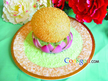 精制葛粉(葛根茎块中提取的淀粉)200克,糯米粉300克,用食用绿色素调匀的椰丝100克,洋葱瓣30克。调料糖200克,水350克,泡打粉15克,色拉油800克,白芝麻30克。