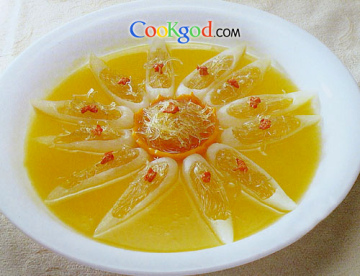2、鱼翅涨发后用鲜汤煲至软糯入味,蟹黄蒸熟后去腥。将鱼翅、蟹黄分别装入雕好的萝卜、南瓜内,入笼屉略蒸,排入盘中,浇用清汤、红花汁调制的汁即成。