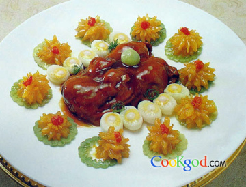 3、将牛蹄下锅炖至软烂,装盘中,用加工好的鞭花、鸽蛋围边。淋上欠汁、明油即成。