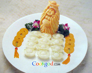 2、冬瓜去皮、瓤,雕刻成元宝形,中间挖空,加鲜汤煲制入味,沥去汤汁,酿入调好的馅料,入笼蒸熟,装盘。