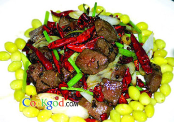 牛月利250克,银杏100克,芹菜段25克。调料干辣椒75克,花椒25克,盐3克,白糖5克,味精1克,料酒5克,碱粉1克,酒酿10克,陈皮1克,大葱段20克,姜片5克,蒜片5克,花椒油5克,二汤300克,色拉油1千克,生粉3克,上汤100克。