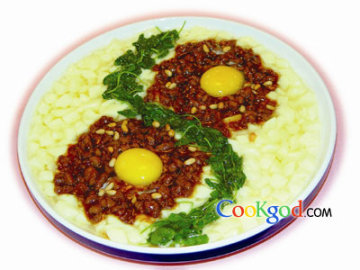 4、草头入沸水中,加盐2克大火汆1分钟取出,摆“s”状环绕在牛肉周围,撒上松子将两个蛋黄放在牛肉丁上即可。