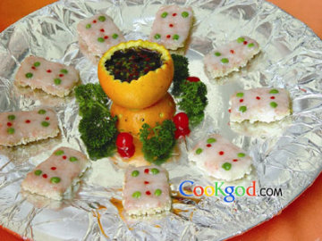 锅巴50克,虾胶250克,橙子1个,锡纸1张。调料梅汁(草莓、柠檬、菠萝、芒果各20克搅成泥后加入糖15克,香醋、青红椒粒5克调匀即可)100克,盐5克,味精2克,色拉油1000克,红椒粒5克,青豆粒10克,香芹、红樱桃各5克。