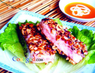 三文鱼一般生吃,因为其他做法的烹调过程不容易掌握。这个菜避免了这个缺点,因为鱼肉外拍了榛子粒,而且不要煎太熟,表层香,肉嫩。