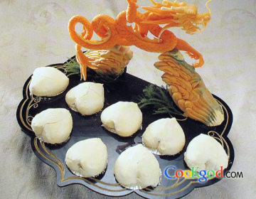 2、海参、松茸、火腿一同制成丝,与鱼翅一同卷在鸽腿上,入笼蒸熟,上面摆上制好的猴头菇,浇入番茄汁,中间放上用芋头刻好的盘饰即成。