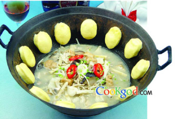 3、锅入猪油,烧至七成热时放入汆过水的黄豆芽入锅内小火煸炒1分钟,加高汤下其他原料,放入盐、鸡粉、白糖小火煮3分钟,入三花淡奶、胡椒粉小火烧开后装入铁锅中,撒入红椒圈、葱花。锅边贴入玉米饼,点上火,盖上锅盖,上桌小火煮15分钟,待玉米饼熟即可。