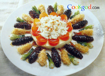海参色泽红亮,虾仁洁白,清淡爽口。