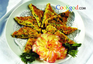 3、锅内放入色拉油,烧至六成热,下入鸡蛋和刺嫩芽调好的糊小火煎2分钟后,翻过来再用小火煎2分钟至两面金黄出锅,将煎好的刺嫩芽分成八份,放入盘中。