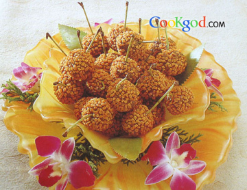 2、将制好的丸子酿入三种果仁,滚面包粒后入油锅炸熟,插上用野山椒茎制成的果棒,装盘即成。