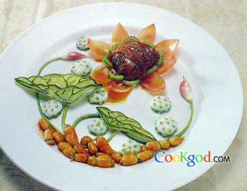 4、西红柿制成荷花瓣形,银鳕鱼、青笋、木瓜切小丁,炒熟后摆放在荷花瓣上即成。