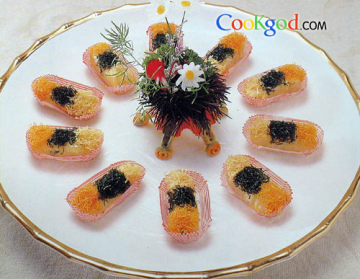 2、将蒸熟的海胆改刀成条,蘸调制好的糊,下入油锅内炸至浅黄色捞出,抹上奇妙酱,点缀做好的菜松,装盘即成。